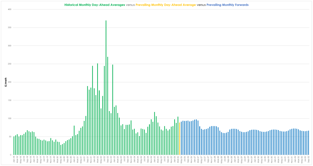 The context chart below shows Historical Monthly Day-Ahead Averages (green columns), prevailing Monthly Day-Ahead Average (single orange column), and prevailing Monthly Forward prices.