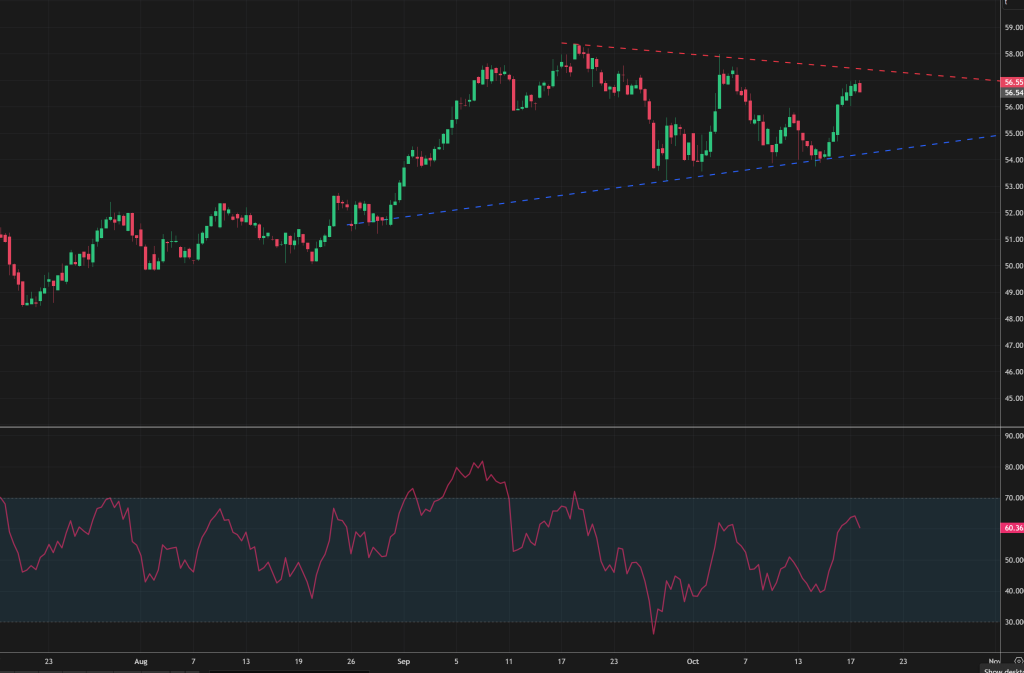 • At the time of writing, prices are holding steady in the mid-50s (currently at £56/tn) – having failed to break out of the triangle to the downside earlier this week.