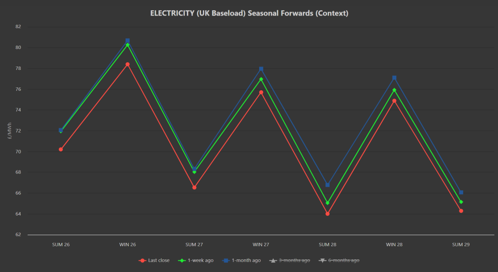 Electricity prices continue to mirror the low volatility of gas markets – as per the chart below, Seasonal Forwards are down versus 1-week/1-month ago.